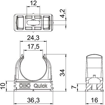 Flush-mounted clip to accept metric steel armoured pipes and heavy-duty insulating pipes, as well as Quick-Pipe® electrical installation pipes. Universal fastening options on walls and ceilings, both in indoor and protected outdoor areas. With slot for side alignment during mounting with wood screw or knock-in anchor. Toolless pipe mounting. Can also be arranged with OBO Multi-Quick or proQuick clip. M16 - M32 size can be screwed onto M6 thread. Recommended fastening spacing 50–60 cm, for max. extraction values F at a room temperature of 20 °C, see the table.