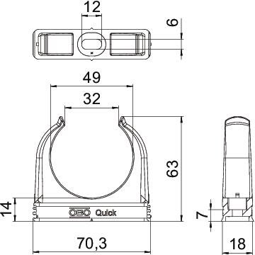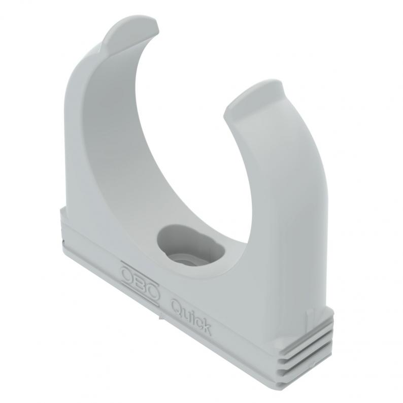 Flush-mounted clip to accept metric steel armoured pipes and heavy-duty insulating pipes, as well as Quick-Pipe® electrical installation pipes. Universal fastening options on walls and ceilings, both in indoor and protected outdoor areas. With slot for side alignment during mounting with wood screw or knock-in anchor. Toolless pipe mounting. Can also be arranged with OBO Multi-Quick or proQuick clip. M16 - M32 size can be screwed onto M6 thread. Recommended fastening spacing 50–60 cm, for max. extraction values F at a room temperature of 20 °C, see the table.