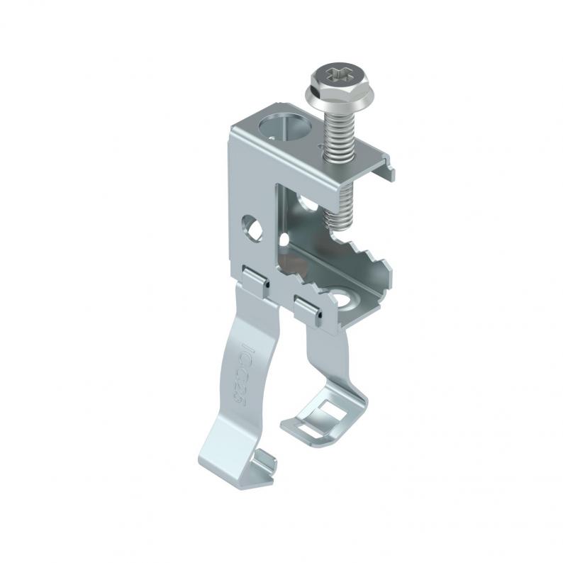 Screw-in support clamp for mounting pipes and cables. Closed pipe seat at bottom. Fastening on steel girders by screwing on.
