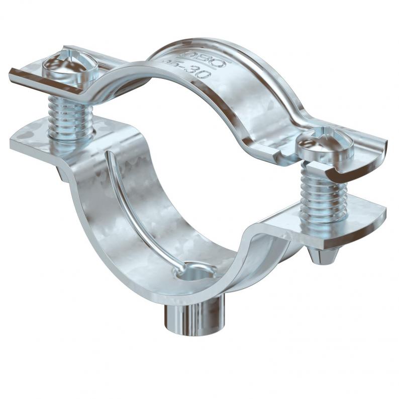 Spacer clip for the installation of pipes and cables on walls, ceiling and floors. With self-locking upper part. Surfaces G and FT from a clip size of 20 are suitable for installation with a nail device or a bolt-firing tool.