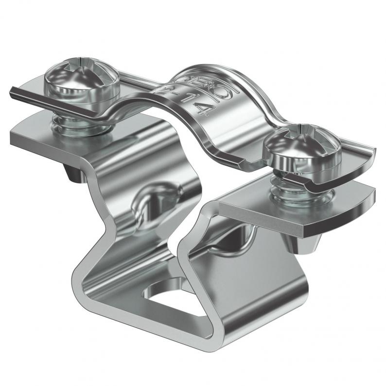 Spacer clip for the installation of pipes and cables on walls, ceilings and floors. With self-locking upper part. Fastening via slot. From the clip size of 20 suitable for installation with a nail device or bolt-firing device.