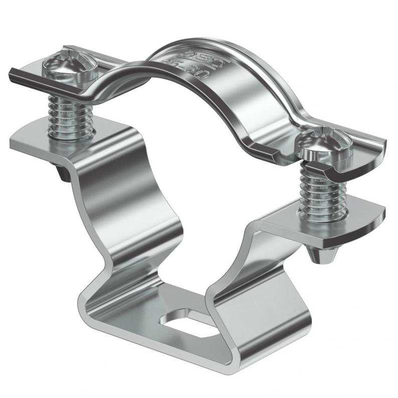 Spacer clip for the installation of pipes and cables on walls, ceilings and floors. With self-locking upper part. Fastening via slot. From the clip size of 20 suitable for installation with a nail device or bolt-firing device.