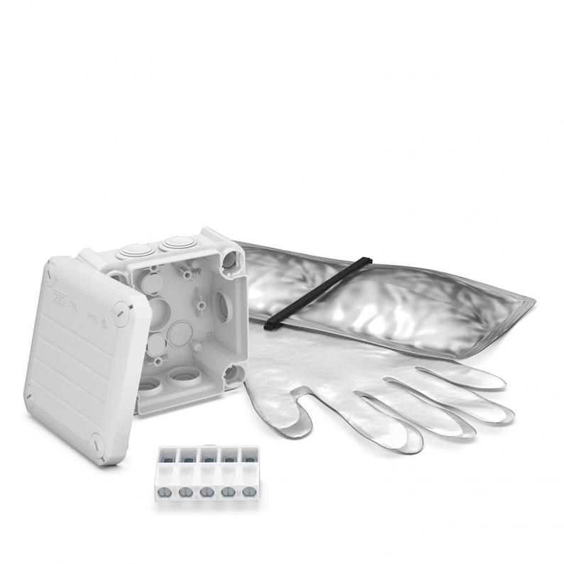 Set consisting of a T 60 junction box with terminal strip, casting resin and a pair of disposable gloves. 2-component casting resin in a mixing bag to protect the electrical installation against moisture, in accordance with the IP68 protection class, and mechanical loads.