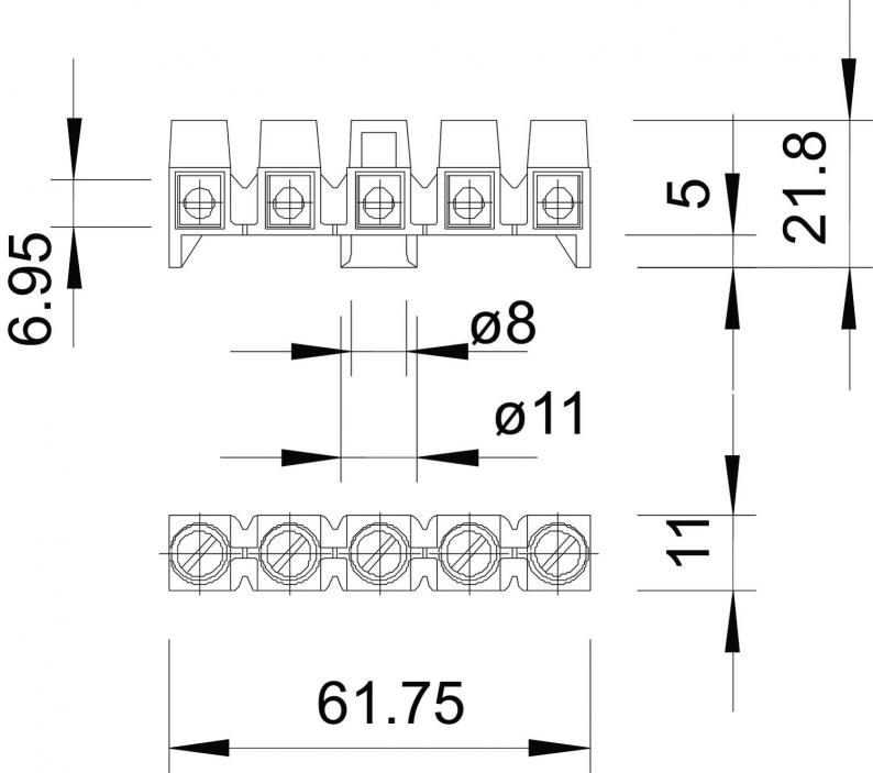 Brass terminal block, nickel plated, steel screws, electrogalvanised and transparently passivated, nominal cross section 0.8 ÷ 2.5 mm², nominal voltage 660 V, 5-pin, with socket terminals, max. connectable cross sections per terminal: 4 x 2.5 mm², 5 x 1.5 mm² or 6 x 1 mm², unused pins can be disconnected and used as individual terminals.
