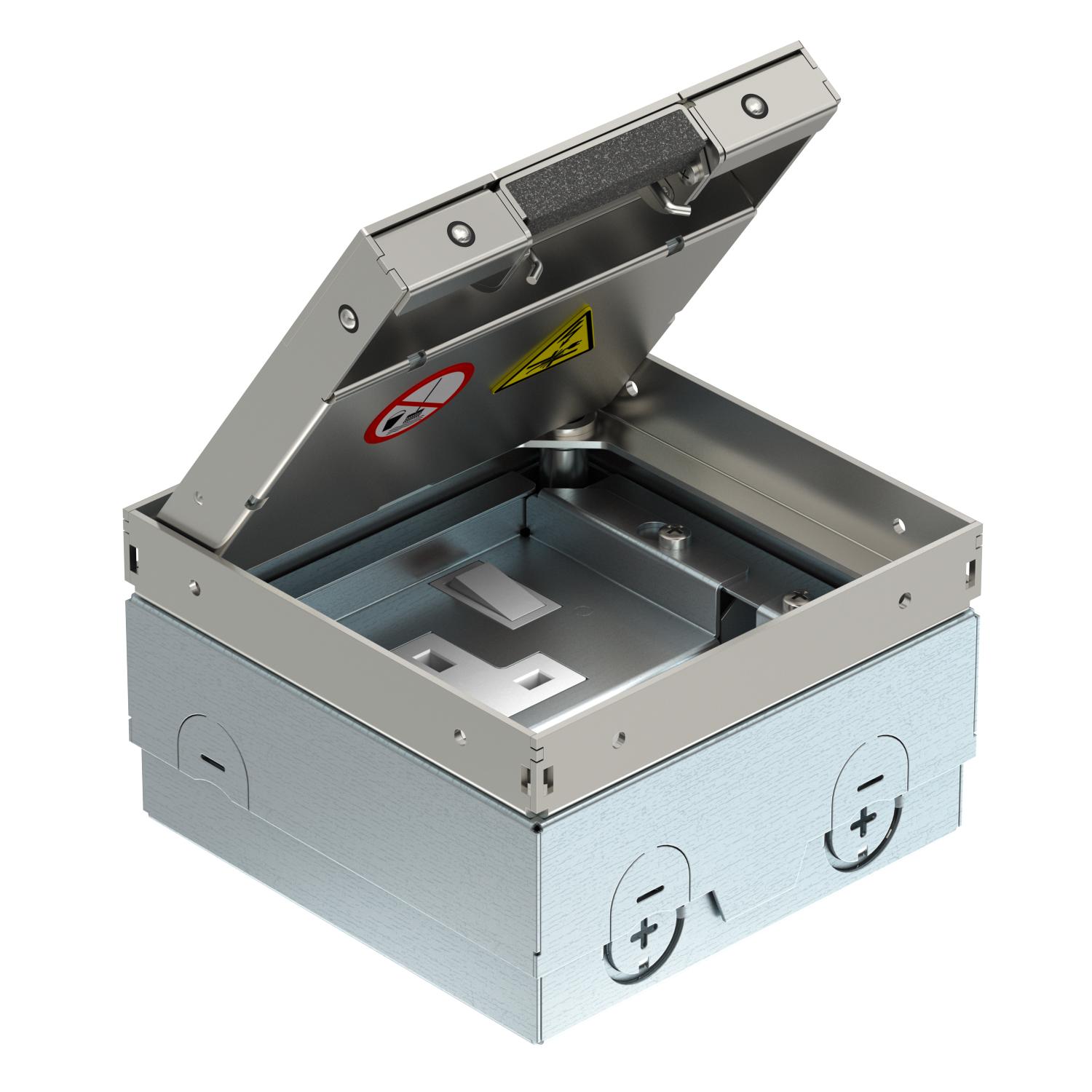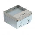 Square floor socket for use in dry-care systems and screed floors in indoor areas. Installation housing with pre-marked insertion openings for pipes (M20/M25). Cover adjustable to top edge of floor covering using four height-adjustment supports. The minimum installation depth is 85 mm, the height adjustment range +20 mm. Frame and cover made of stainless steel and visible in the floor covering. Cover with floor covering recess. The delivery includes a switched BS socket.