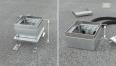 Square floor socket for use in dry-care systems and screed floors in indoor areas. Installation housing with pre-marked insertion openings for pipes (M20/M25). Cover adjustable to top edge of floor covering using four height-adjustment supports. The minimum installation depth is 75 mm, the height-adjustment range +30 mm. Frame and cover made of brass and visible in the floor covering. Cover with decorative plate oriental. Empty housing for a 45® installation device and a data socket. When delivered, the item is closed with a blanking plate.