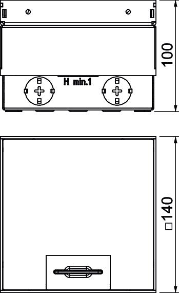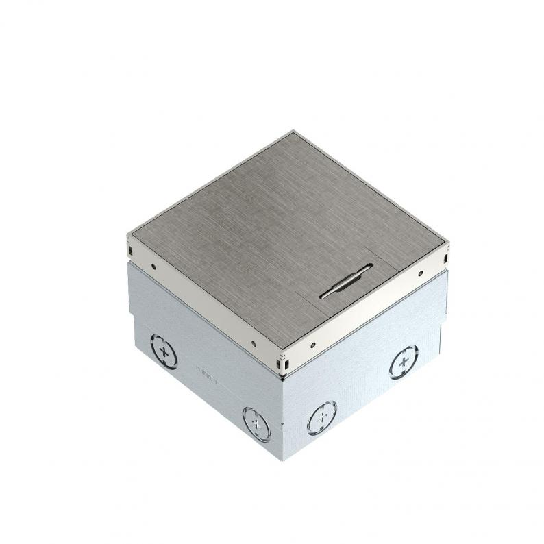 Square floor socket for use in dry-care cavity and screed floors in indoor areas. Installation housing with pre-marked insertion openings for pipes (M20/M25). Cover adjustable to top edge of floor covering using four height-adjustment supports. The minimum installation depth is 100 mm, the height-adjustment range 35 mm.Frame and cover made of stainless steel and visible in the floor covering. Cover with Cross hatch decorative plate. Empty housing for up to 2 Modul 45® devices in the mounting support and 2 data sockets in the optional data technology support.