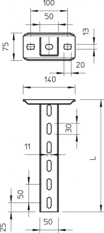 For fastening to horizontal concrete ceilings and steel girders. For bracket widths of 400 mm or more, or if the bracket is mounted at the end of a suspended support, we recommend the use of the spacer, type DSK 45.