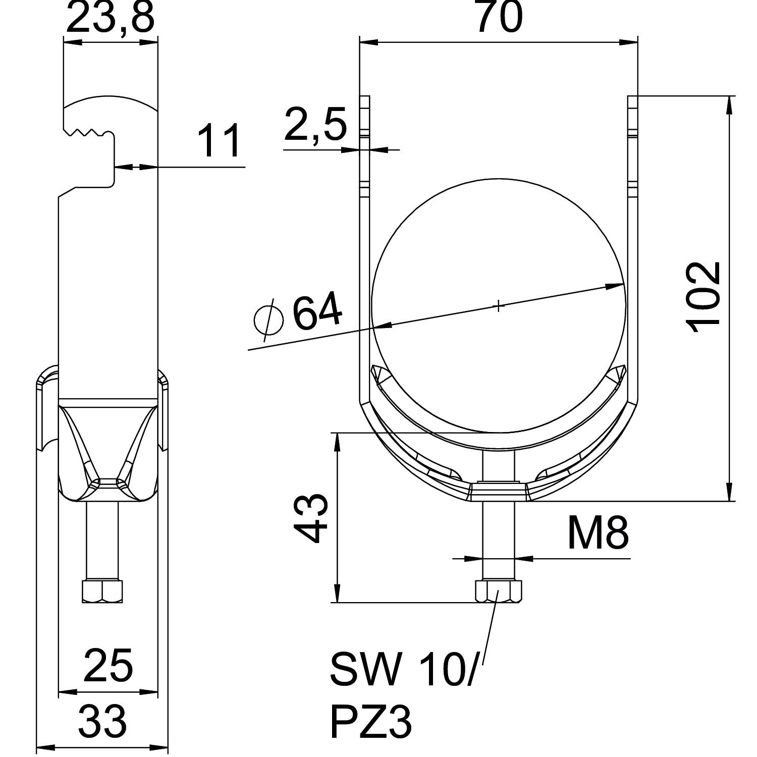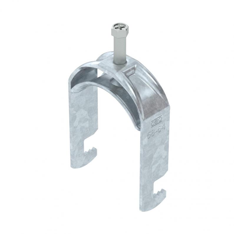 Clamp clip with F-foot, metal pressure sleeve with rounded edges to protect the cable. For vertical and horizontal mounting of 1 single cable on flat bars. With 1-start screw thread on pressure sleeve, universal hexagonal screw head WAF10, with slot and cross recess. Suitable for assembly indoors and outdoors. We recommend the use of a counter-sleeve.