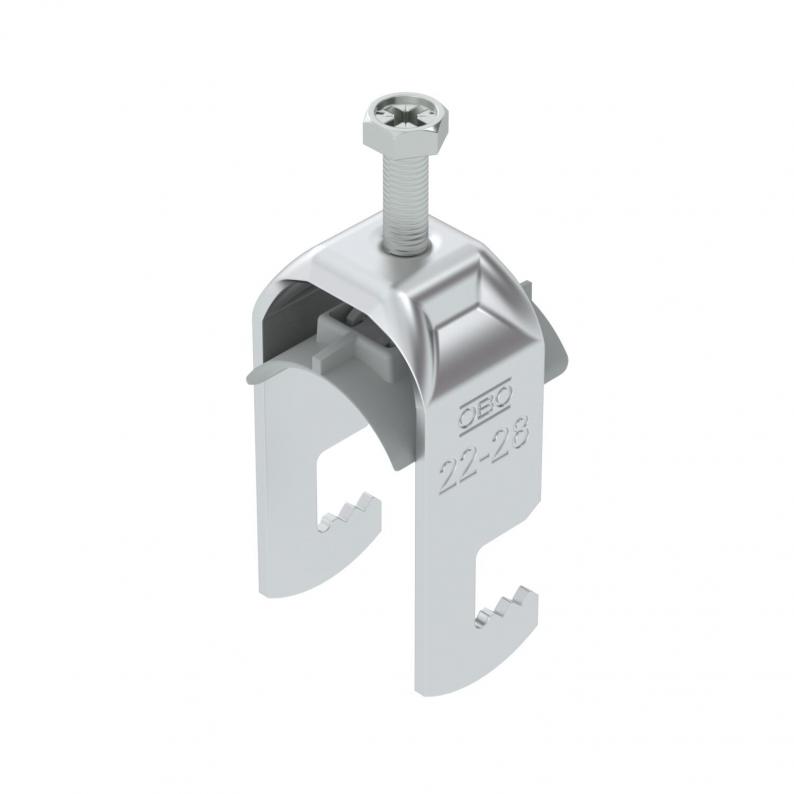 Clamp clip with F-foot, plastic pressure trough made of polypropylene. For vertical and horizontal mounting of 1 single cable on flat bars. With 1-start screw thread on pressure trough, universal hexagonal screw head WAF10, with slot and cross recess. Suitable for mounting indoors and outdoors. We recommend the use of a counter-trough.