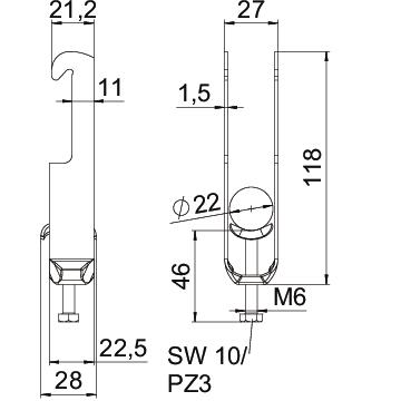 Clamp clip with W-foot, metal pressure trough with rounded edges to protect the cable. For vertical and horizontal mounting of 2 single cables on angle irons shaft length 40 mm. With 1-start screw thread on pressure trough, universal hexagonal screw head WAF10, with slot and cross recess. Suitable for mounting indoors and outdoors. We recommend the use of a counter-trough.