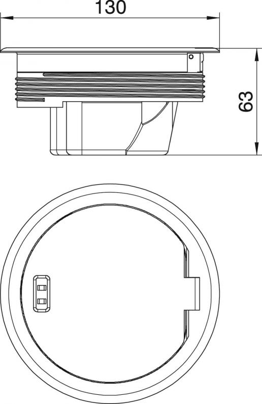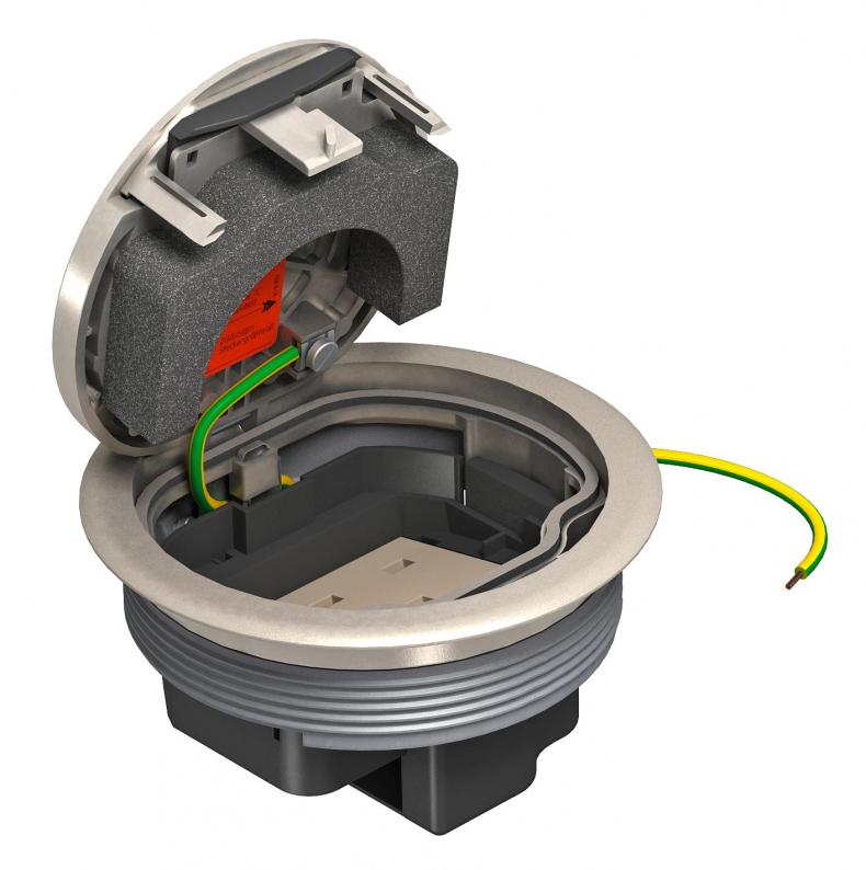 Round service outlet with pre-fitted single-gang power socket, switched (BS-type). The service outlet has a floor covering protection frame and can be used in combination with an underfloor box UZD or an underfloor outlet box UDL2-120 for indoor use. The minimum installation depth is 70 mm.