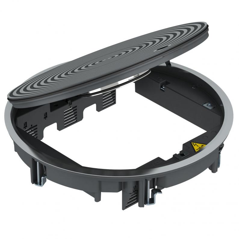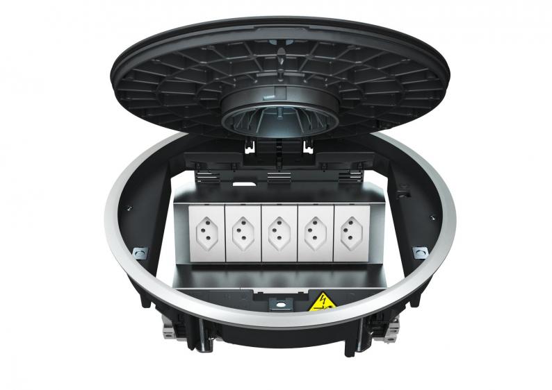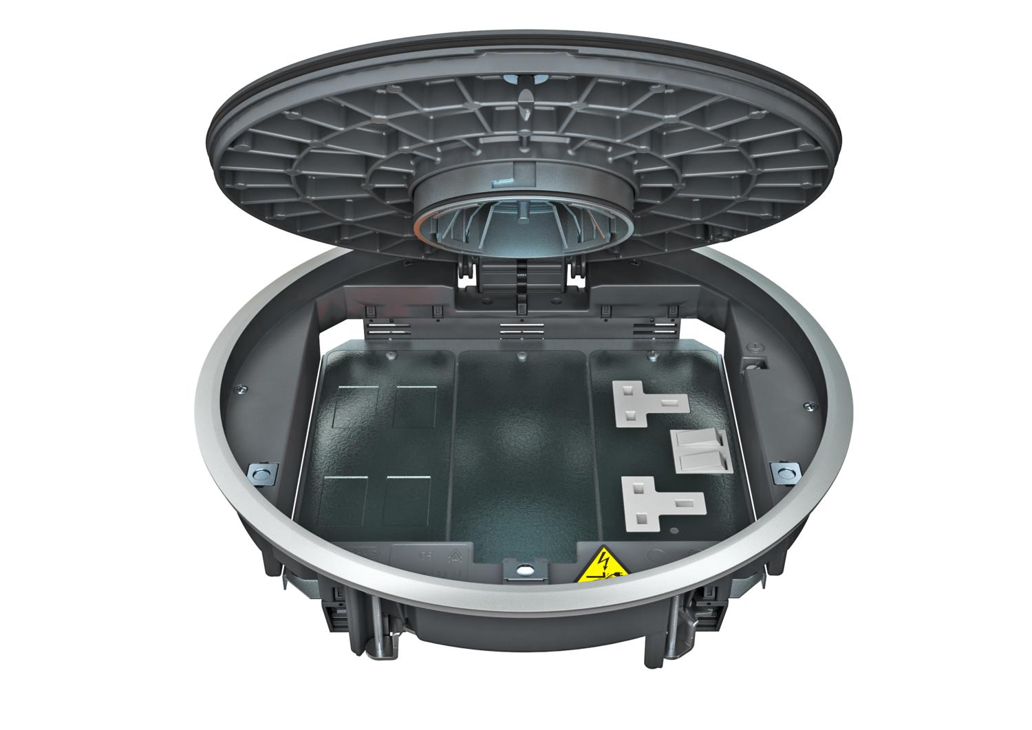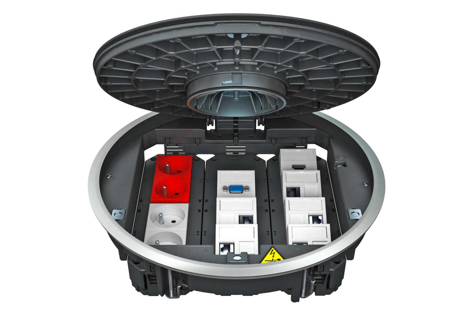 Service outlet with tube body for wet-cleaned floors for up to 12 individual Modul 45 devices in 3 UT4 universal supports, use in duct and trunking systems and system floors indoors.