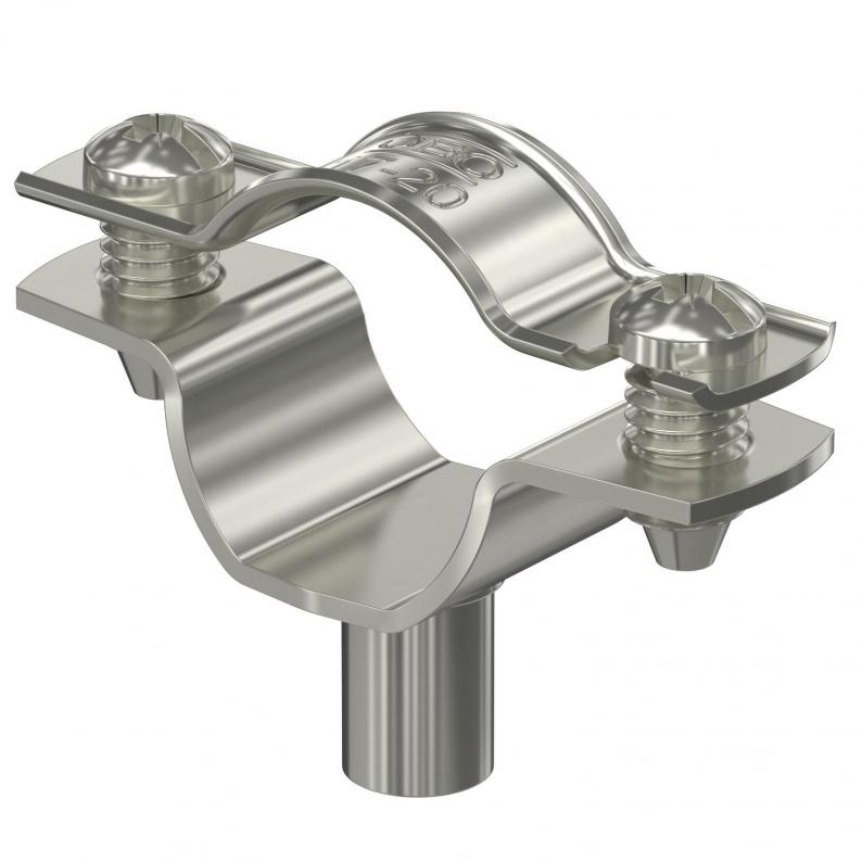 Spacer clip for the installation of pipes and cables on walls, ceilings and floors. With self-locking cover. Fastening via attachment piece with internal thread.
