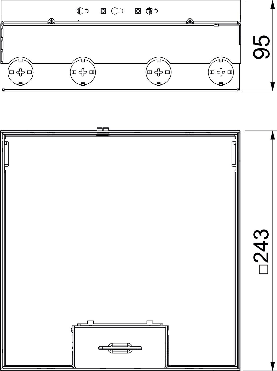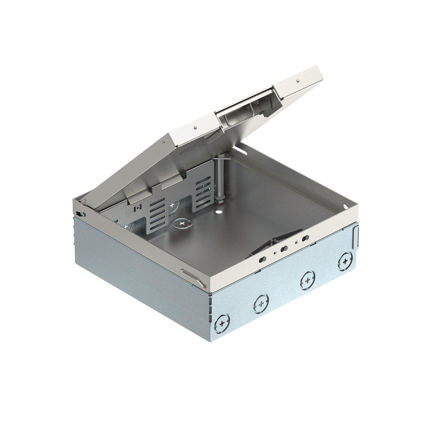 Square floor box for use in dry-cleaned cavity and screed floors in indoor areas. Installation housing with pre-marked insertion openings for pipes (M25). Empty housing for up to three UT4 universal supports for up to 12 Modul 45 ® devices. Cover adjustable to top edge of floor covering using four height-adjustment supports. The minimum installation depth is 95 mm, the height-adjustment range + 30 mm.