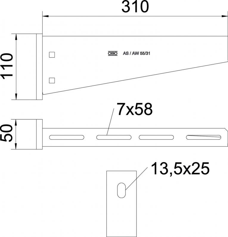 Fastening of the bracket to the U support of width 400 mm or greater using a hexagonal bolt through both sides of the support. Please insert suitable spacers.